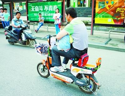 前天早上9点,网友杨先生到武昌才华街附近办事,走到友谊大道才华街公交车站时,看到一名男子,骑着电动车在马路上自由穿梭,令他大跌眼镜的是,这名男子手中居然还抱着一个一两岁左右的男童。