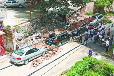 围墙垮塌砸坏4辆车。记者杨涛 摄