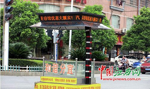 20日,记者走访分宜县城三个交警指挥岗亭,发现岗亭基座都贴有分宜县某公司的地址和热线电话,三个岗亭顶盖四面安装了电子显示屏,其中有一个坏了,另外两个滚动播放分宜某公司的广告。