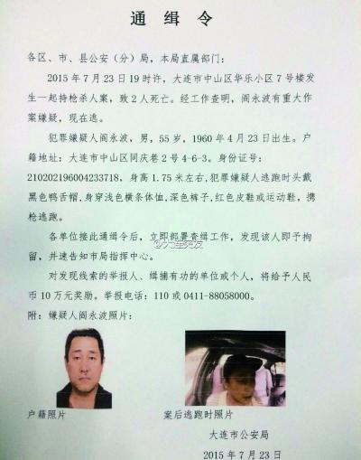 昨晚11时许,大连市公安局网络安全保卫支队官微发声称,大连市中山区华乐小区7号楼昨夜发生持枪杀人案,经工作查明,阎永波有重大作案嫌疑,并贴出通缉令照片。