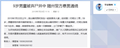 湖北随州9岁男童被弃尸井中 警方悬赏2万通缉(图)
