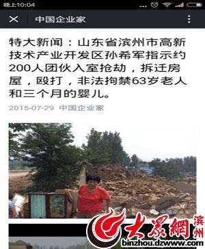 7月26日,微信圈里发出一条“特大新闻”称,2015年7月25日,滨州市民李翠珍在承包地上建造的20多间房屋以及2500多平方米的养殖大棚遭遇滨州市高新区小营办事处强拆,屋内床、橱柜、电视、冰箱、洗衣机、电脑等家具及生活物资全部被埋在废墟中,7000多只家禽死亡。强拆过程中,李翠珍及女儿 、女婿还有3个月大的外甥遭到殴打被强行抬上车拉走,后被关在一间屋子里限制人身自由达6小时以上。该微信还晒出了多张拆迁现场照片以及土地承包合同和公证书。此微信发出后,引发网友广泛关注,并迅速传播。