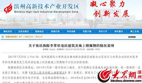 2015年7月25日上午,滨州高新区小营街道办事处配合高新区城管办公室及许王村委会对该村村民李翠珍违章建筑及已收回承包地上的其他地上附属物予以依法拆除清理。“对李翠珍违法建筑的拆除清理行为是按照相关法律规定和政策进行的合法行为,希望广大网民不要相信和传播网上毫无根据的谣言。”该工作人员告诉记者 (记者 王君彩)