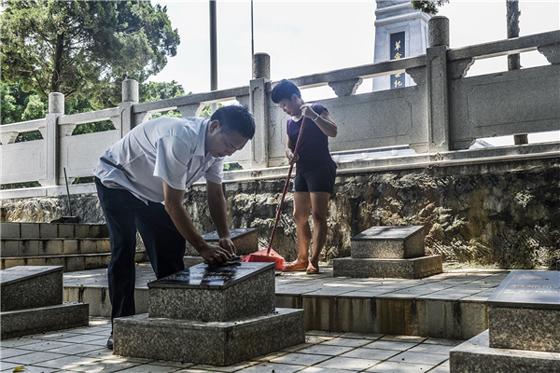 黄金良夫妇在清扫烈士陵园、擦拭墓碑