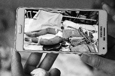 昨天下午,记者在海军总医院见到了小俊林。由于脑积水的原因,小俊林的头部高高鼓出一个包。虽然双眼可以睁开和眨动,但实际上他对外界没有任何反应。