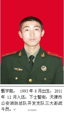 此前一天,6名消防官兵的身份已确认,他们是邵俊强、田宝健、杨钢、尹艳荣、袁海、甄宇航。