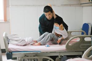在西安市儿童医院住院部,张财柱正在精心照料儿子晓明。 记者 张宇明 摄