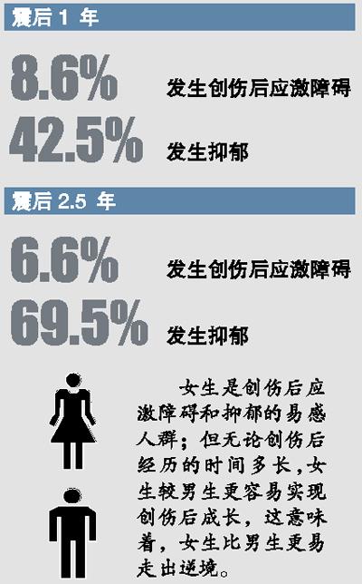 北京师范大学心理学院伍新春教授团队对地震重灾区小学、初中和高中学生的创伤后应激障碍、抑郁、创伤后成长、行为问题及其相关预测因素,进行了历时6 年的连续7 次追踪调查。今年1月,题为《青少年创伤后心理反应的影响机制及其干预研究》的成果在《心理发展与教育》上发表。
