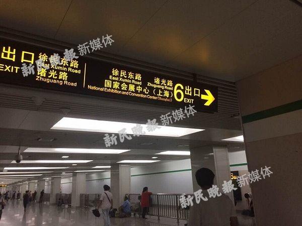 据介绍,随着今晨雨量的不断增大,2号线徐泾东站周边地区路面积水严重。为了防止路面积水倒灌进站内,站方在徐泾东站6、8、9号三个出入口均采取了防汛措施。具体为:8号口、9号口周围各放置了一块防汛板,6号口周围则放置了两块防汛板,高度均在30厘米左右。