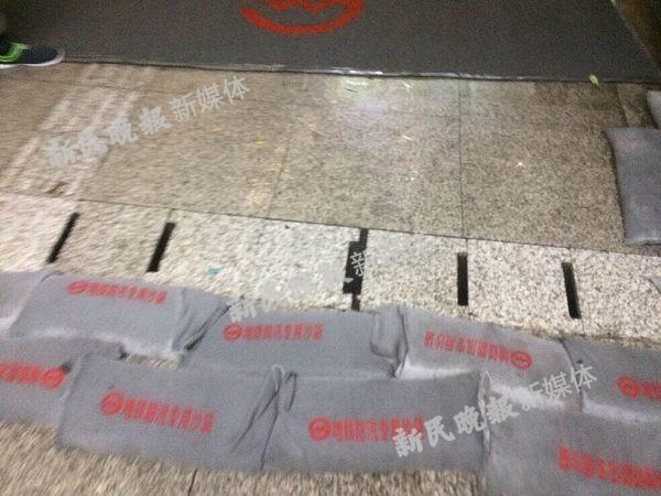 图说:徐泾东地区路面积水严重,地铁站采取防汛措施。新民晚报新民网 李欣 摄