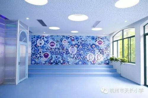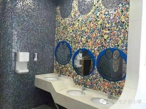 地中海风格的教学楼,6米宽的走廊,随处可见的书架,极富童趣有Hello Kitty、哆啦A梦的洗手间,全透明窗户且配有洗手池的教室等等。