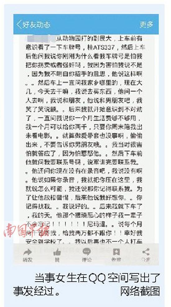 微博称,一名女生从南宁动物园打车前往广西民族大学,上车前有意识看了一下车牌号:桂ATS337。记者查看了当事女生的QQ空间,看到该女生在QQ空间上描述了事发经过。该女生QQ空间说:“我上车后,他就问我:‘你刚刚为什么看我车牌号,是怕我把你拐卖或者强奸吗?’”该女生找了个理由搪塞过去。