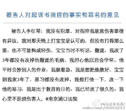 “我对那天晚上打宝宝是认可的,但并没有打得那么重,也不可能构成轻伤。宝宝到我家3年了,恶习都没有改掉,我想打他一下,改一下他的恶习,我是出于教育的目的,我心里不是想伤害人”被告人李征琴称。