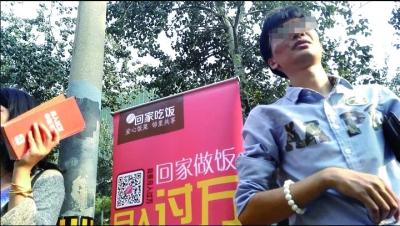 在海淀区皂君庙附近,两名工作人员在宣传“回家吃饭”的APP,主打“月入过万”