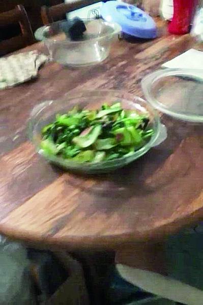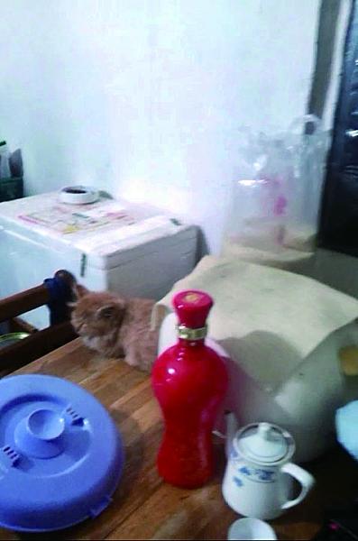 厨房外间摆放的东西很多,瓶瓶罐罐杂乱无章地堆在地上。桌子上摆放着刚做好的油菜。菜的旁边,一只小黄猫静静地趴在桌子上,眼睛不时地盯着盘里的油菜。它和桌子下的狗一样,进来了陌生人后,总要看上一眼。