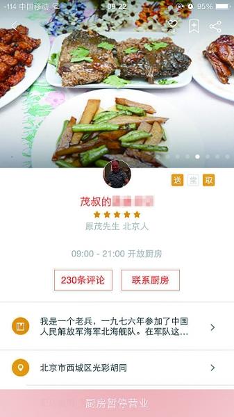 根据软件平台上的介绍,9月17日中午,记者在西城区月坛南街附近找到了为“回家吃饭”平台供餐的一户居民家。网上的图片里,做饭师傅系着红色围裙,端着一盘精美的菜。