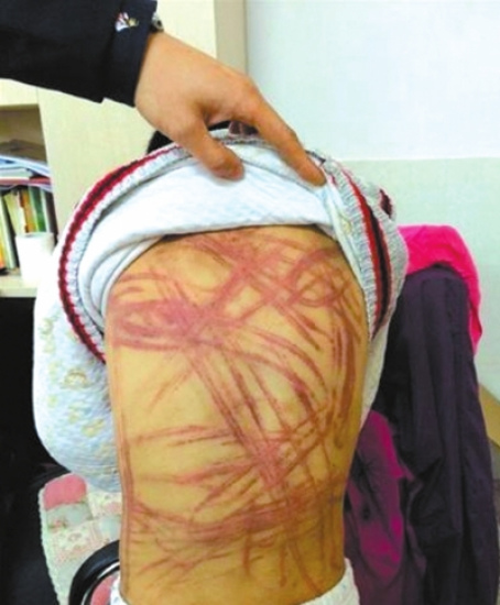 施某某个子不高,但很乖巧。见记者走到跟前,他还起身让座。“你的伤好了吗?”记者问,孩子懂事地自己掀起衣服,记者将他带到灯光下,仔细查看了他的后背和前胸,发现已经没有被抽的痕迹,“不疼,早就全好了。”施某某说。