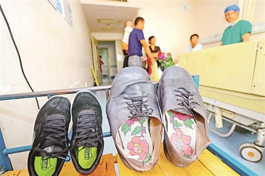 昨日上午,在武汉协和医院手外科病房,28岁的张华右腿绑着绷带。楚天都市报记者看到两双鞋子摆放整齐,一双是父亲40码的鞋子,另一双则是他的,足足有60码,看上去像两只小船(如图)。