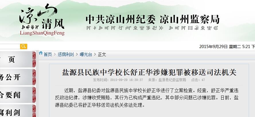 四川盐源民族中学校长舒正华涉嫌犯罪被移送司法机关