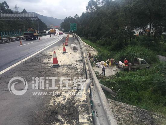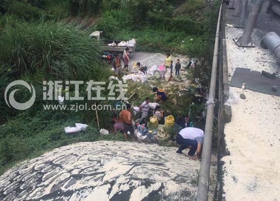 浙江一半挂车撞护栏 30余吨大米抛洒引村民哄抢