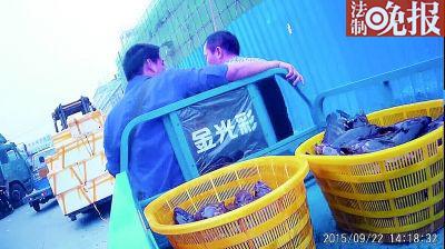 9月20日中午,家住东城区天坛东门附近的居民崔先生,与朋友一同来京深海鲜市场购买海鲜,当他们由市场东侧的“大闸蟹区”向西走到“京深物流园区”时,正巧赶上一辆活鱼运输车在卸活鱼。只见站在车顶上的人,用大抄子将活鱼从水箱中抄出,倒进等在车旁的三轮车的塑料箱中,再由三轮车分别送到活鱼摊位上。