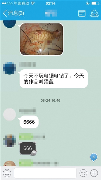新京报记者获得了多张虐猫群截图,疑似当事学生的QQ用户在群里用照片直播的形式,将一只小黄猫锯掉四肢,并砍下了脑袋,现场鲜血淋漓,并自称“今天的作品叫做猫彘”。