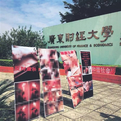 昨日中午,多名动物保护志愿者前往该校门前拉起横幅、悬挂虐猫照片表示抗议,并通过微博公布了涉事学生的虐猫视频。此后,广东财经大学学生通过微信公众平台发布消息,称动物保护志愿者行为过当,“人肉学生照片,将虐猫视频二次传播不妥”。