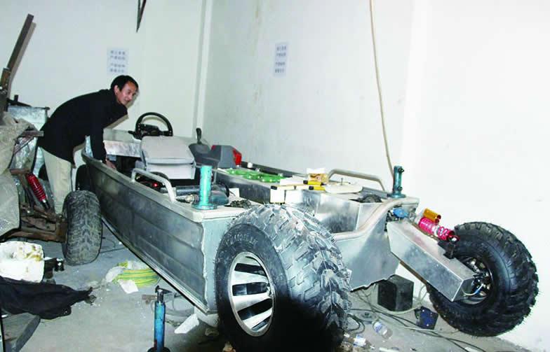 青岛西海岸新区薛辛庄社区一间10平方米大小的地下车库就是赵洪波的厂房。昨天,记者来到这里,幽暗的车库内,一辆类似游艇的汽车展现在面前,赵洪波按下按钮,汽车后轮慢慢上升、收缩。“这是第二代水陆两栖艇,艇身长6米,重达1.32吨,还没有全部完成,后轮和前轮都需要进行升级调整,半个月后就可以出库了。”32岁的赵洪波说,这台水陆两栖艇可以在水上、陆上两栖运行,油电都可以使用,陆地时速达70公里,水上时速近160公里。