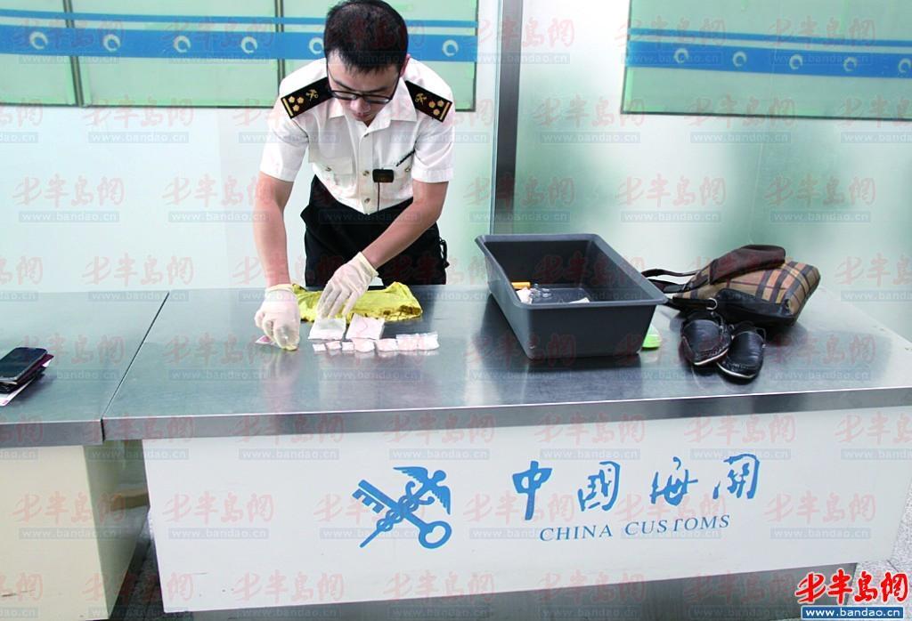 据青岛海关隶属流亭机场海关介绍,案发当日上午8时左右,一名中国籍男性旅客经过安检通道时,神色异常,形迹可疑,根据线索,海关关员对其人身及行李物品进行了全面检查。搜身发现,该名男子套穿了两条内裤,且两内裤有疑似缝合痕迹,经进一步检查,在其两内裤的夹层中,藏匿白色晶体9包,红色药丸1包。