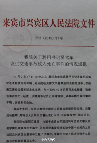 记者从当地法院获悉,2日下午,广西来宾兴宾区法院一工作人员在执行公务期间,驾车途经当地某幼儿园附近时发生车祸,与一10岁男孩发生碰撞,致其死亡。经确认男孩为当地宁柳小学学生。目前,涉事法院工作人员已被带走调查,事故责任尚未认定。(央视记者廖汨)