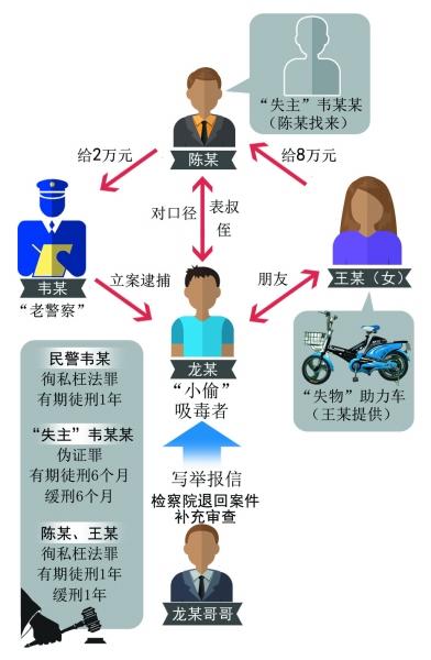 龙某的家属发现后不能接受,举报到检察院,使得假案暴露。《法制晚报》记者了解到,广西桂林荔浦县法院以徇私枉法罪对民警韦某及龙某的亲朋分别判刑,“失主”也因伪证罪被判处缓刑。