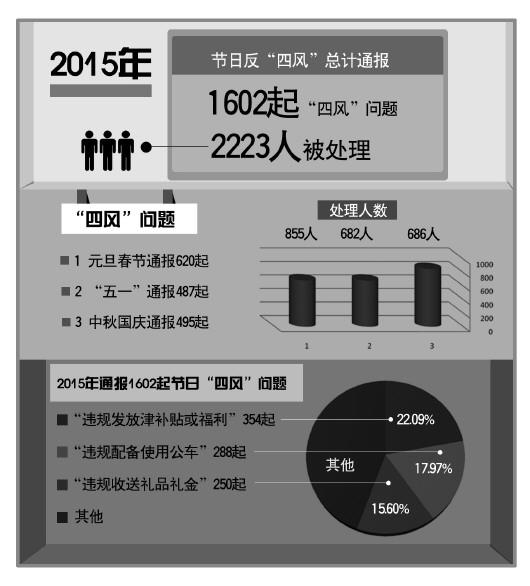 《法制日报》记者梳理发现,2015年,中央纪委监察部网站先后开通了元旦春节、“五一”、中秋国庆3次纠正“四风”监督举报曝光专区,总计通报了1602起“四风”问题,2223人被处理。
