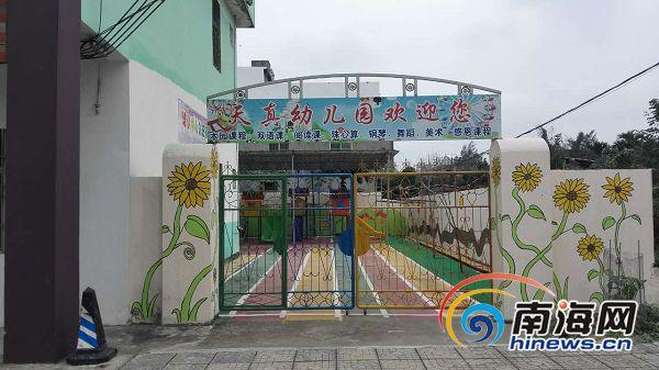 南国都市报记者来到“天真幼儿园”采访时,发现该幼儿园就在长坡镇委镇政府对面的一栋三层民居里,前面有一个玻璃大门,校门口则是从后面的一个铁栅大门进去,上面挂着“天真幼儿园欢迎您”。