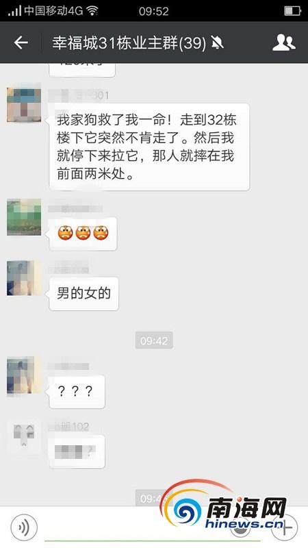 该小区31栋楼一居民说:“我家狗救了我一命,走到32栋它不肯走了,我停下来拉它,那人就摔在我前面两米处。”