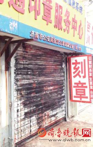 店主陈女士告诉记者,早晨7点多她来店里上班时,刚打开车门就看到店铺的卷帘门上被涂满了红色和黑色的油漆,“门上、地上到处都是”,就连门口招牌上的“济南市公安局指定公章刻制企业”字迹也被油漆涂红。陈女士立即报了警。