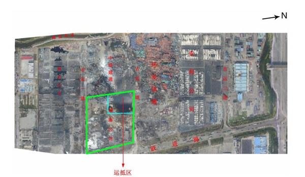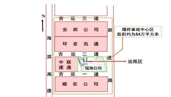 事故现场按受损程度,分为事故中心区(航拍图见图2、示意图见图3)、爆炸冲击波波及区(示意图见图4)。事故中心区为此次事故中受损最严重区域,该区域东至跃进路、西至海滨高速、南至顺安仓储有限公司、北至吉运三道,面积约为54万平方米。两次爆炸分别形成一个直径15米、深1.1米的月牙形小爆坑和一个直径97米、深2.7米的圆形大爆坑。以大爆坑为爆炸中心,150米范围内的建筑被摧毁,东侧的瑞海公司综合楼和南侧的中联建通公司办公楼只剩下钢筋混凝土框架;堆场内大量普通集装箱和罐式集装箱被掀翻、解体、炸飞,形成由南至北的3座巨大堆垛,一个罐式集装箱被抛进中联建通公司办公楼4层房间内,多个集装箱被抛到该建筑楼顶;参与救援的消防车、警车和位于爆炸中心南侧的吉运一道和北侧吉运三道附近的顺安仓储有限公司、安邦国际贸易有限公司储存的7641辆商品汽车和现场灭火的30辆消防车在事故中全部损毁,邻近中心区的贵龙实业、新东物流、港湾物流等公司的4787辆汽车受损。