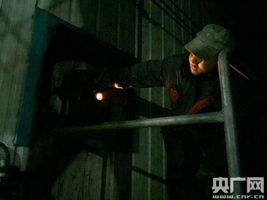 司炉工透过炉门孔径 观测炉内火焰 火光映红他的脸颊