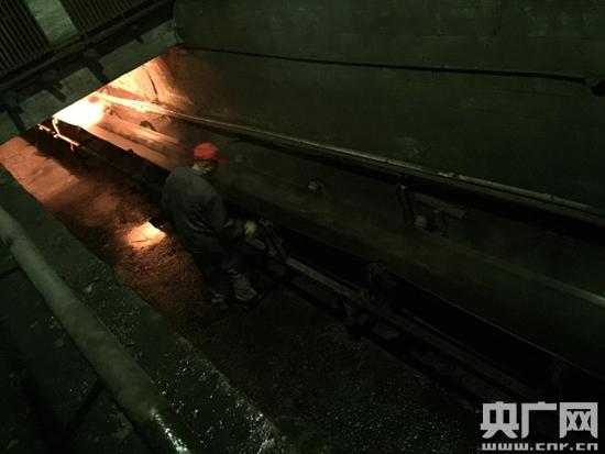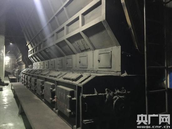 燃烧后的煤渣通过链条式输送带运出,工人正在检查传送带运行状态