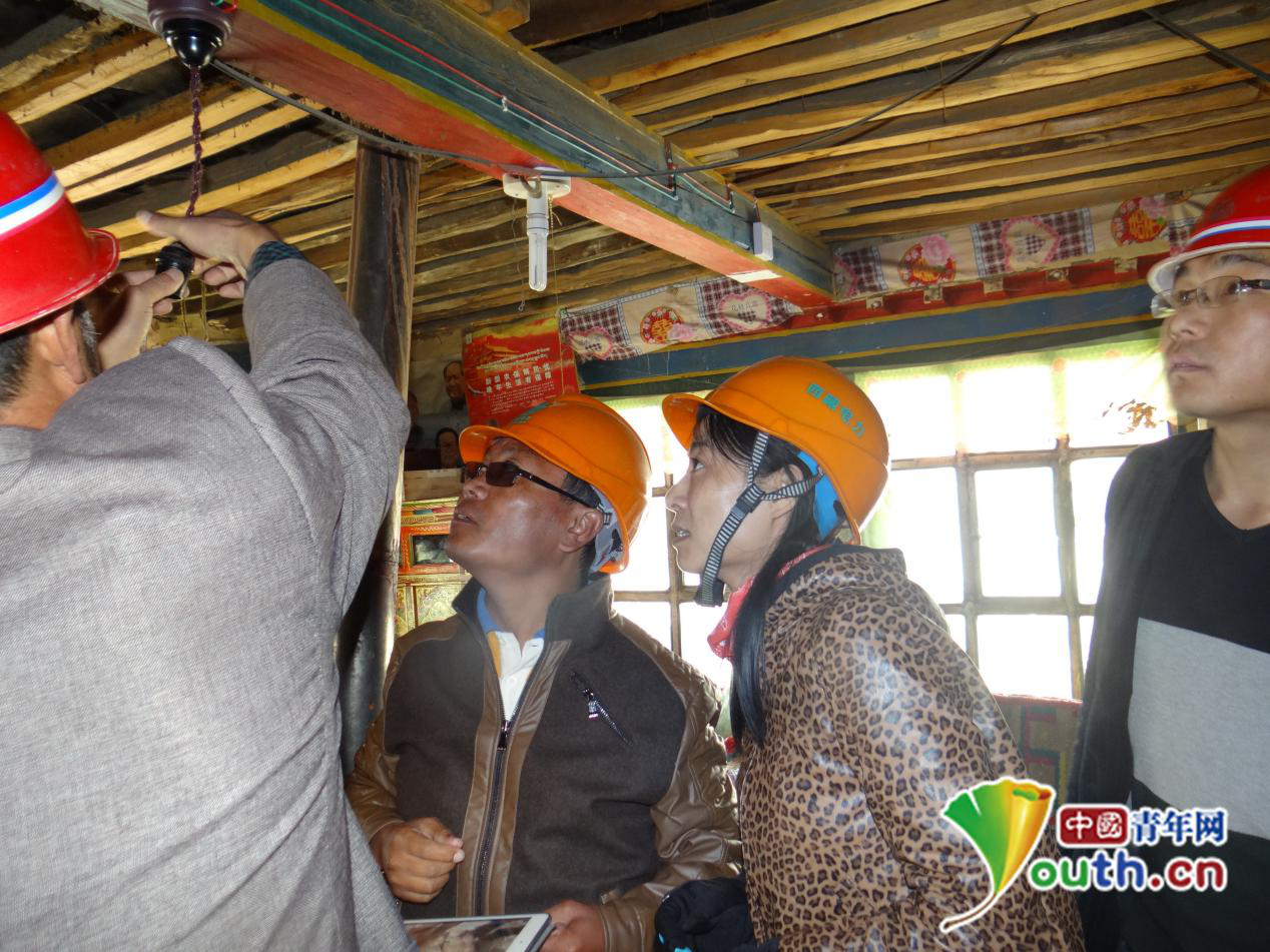 陈婧(右二)在藏族村民家中进行户表验收工作。 陈婧供图