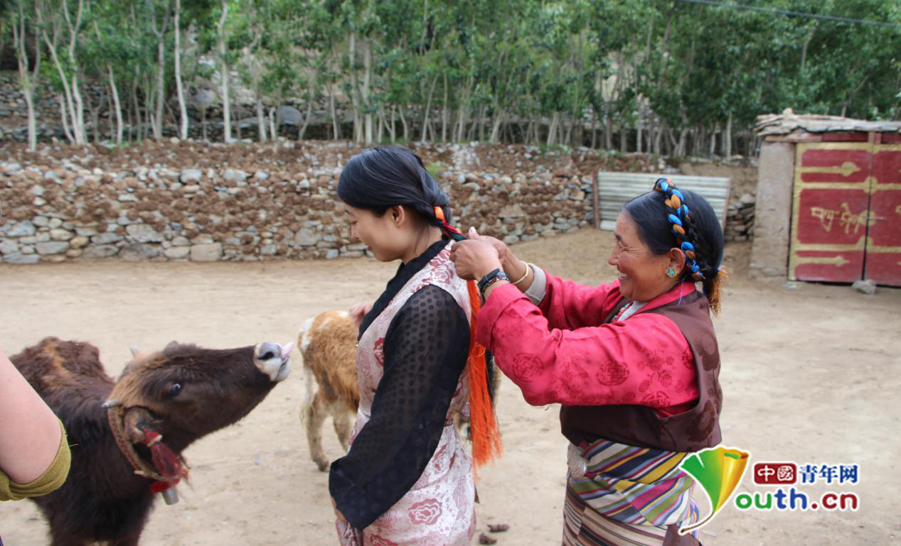 贡嘎的母亲为陈婧结藏式发辫。 陈婧供图