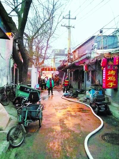 昨天下午,记者到达时,明火已经被扑灭,现场一片狼藉,消防人员正在对着火的位置进行喷水降温。发生火灾的餐馆位于胡同深处,由于胡同狭窄,消防车根本进不去,为了迅速灭火,消防员不得不将水管接了数百米长,才有水可用。记者看到,受此次火灾影响,事发餐馆旁的两间房屋遭到不同程度的损坏,餐馆正对面的小卖部,门窗也被烤坏。住在餐厅旁边的一户居民说,下午两点多时,他正在屋里,发现有烟冒了进来,就赶紧报了警,幸亏消防车来得快,火还没有着大就被扑灭了,他的房子未被波及。