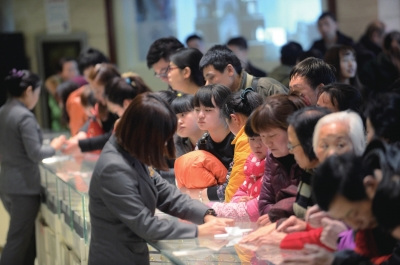 国际金价虽然一直上涨,但是北京菜百、国华等各大黄金卖场的报价都是按照节日期间已休市的上海黄金交易所价格确定,因此,节日期间黄金价格并没有跟进上涨,再加上春节本身就是黄金消费旺季,京城金店客流增大。