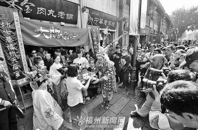 “金猴、财神来啦!”昨天是正月初五,民间有开市迎财神之俗。三坊七巷昨天举行了“财神有约、大胜(圣)归来”祈福开市活动,不少市民赶来讨个好彩头。