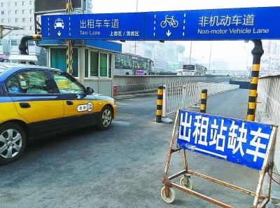 春节返京潮,让北京西站的出租车站显得车源不足,几乎是来一辆走一辆,所以出租站将告示牌推到路边,希望招呼出租来救急,昔日的“车等人”变成“人等车”了。 庞铮铮摄