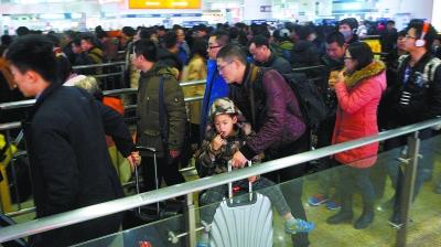 从北京南站走进地铁,一路坐到昌平线,选择今天回京的张先生与爱人的最大感受是:几乎所有旅客都背着大包小包。途中,张先生的脚还几次被其他乘客行李箱的轮子碾到。在西二旗站开往郊区方向的站台上,每个门区前都有四五个人在等候列车。据北京地铁昌平线乘务中心副主任侯君介绍,“现在时间比较早,等到中午和晚上,预计旅客会更多。”他还告诉记者,昌平线除夕当天的总客流量为2.6万人次,昨天总客流则达到5万人次,约是除夕当天的两倍。等出了正月,客流将回到每天20万左右的正常水平。“我们已通过在两个终点站加强发车时刻和方向广播、把温度调到适宜乘客出行温度等措施,保障乘客平安返京。”