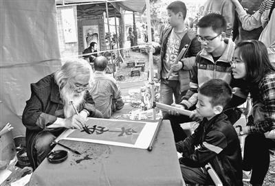 在书法庙会上,很多家庭向书法先生表达健康平安、财源广进的新年愿望,书法先生即兴挥毫,遒劲隽永的“福”“禄”“康”等寓意美好的汉字跃然纸上。