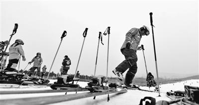 2月11日,北京某滑雪场内,教练正在向学员教授滑雪技巧。春节长假,北京雪上项目火爆,预约教练需要排长队等待,一人带着五人练。