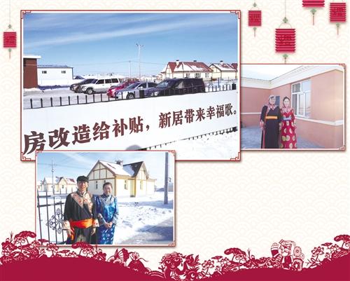 左下 鄂温克旗巴彦塔拉达斡尔民族乡伊兰嘎查蒙古族牧民敖长虎和妻子在新居民口笑迎来客。
