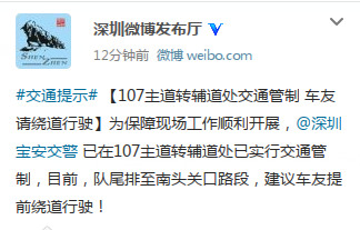 深圳市互联网信息办公室通过官方微博提醒,为保障现场工作顺利开展,深圳宝安交警 已在107主道转辅道处已实行交通管制,目前,队尾排至南头关口路段,建议车友提前绕道行驶。