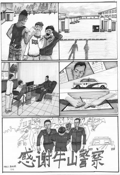 4月23日,北京工业大学耿丹学院大二学生薛义给牛山派出所的民警送上了一张自己画的漫画,感谢民警帮他挽回了近万元的经济损失。漫画上展示了他被骗后求助民警,以及民警破案后嫌疑人被抓获的画面。